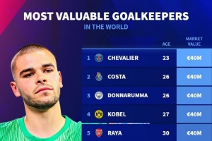 體育資訊11月1日訊 德國轉(zhuǎn)會市場統(tǒng)計(jì)了門將的身價,并列出榜單,多納魯馬、科貝爾、拉亞等5人并列居首。