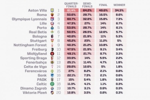 體育資訊12月12日訊 opta在當(dāng)?shù)貢r間12月11日對本賽季歐聯(lián)杯形勢進(jìn)行了新的預(yù)測,阿斯頓維拉奪冠概率達(dá)到34.3%,羅馬8.6%第二。