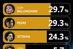 體育資訊12月12日訊 環(huán)球足球獎(jiǎng)公布了年度最佳中場的投票情況,貝林厄姆居首,佩德里次席。
