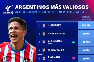 體育資訊12月13日訊 德國(guó)轉(zhuǎn)會(huì)市場(chǎng)更新了西甲球員的身價(jià),并列出西甲阿根廷球員身價(jià)排名,阿爾瓦雷斯1億歐居首,馬斯坦托諾5000萬歐次席。
