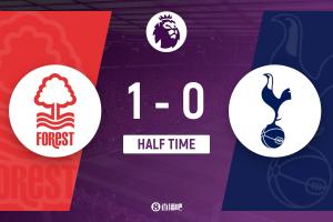 上半場比賽結(jié)束,諾丁漢森林1-0熱刺。