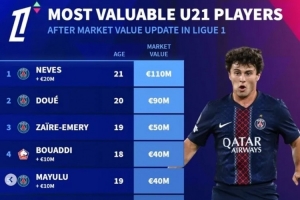 體育資訊12月15日訊 德轉更新了法甲球員身價情況,并列出了U21最貴身價榜,內維斯壓杜埃居首。