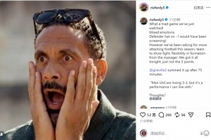 曼聯(lián)名宿費迪南德社媒曬出自己一臉驚訝的照片,并寫道:“我們剛剛看了一場多么瘋狂的比賽!心情復(fù)雜。以防守球員的身份來說——我(要是還在場上)肯定會大喊大叫!”