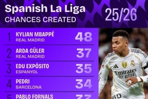 本賽季西甲創(chuàng)造機(jī)會(huì)榜:姆巴佩48次居首,居萊爾37次第二