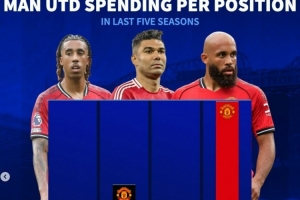 體育資訊12月16日訊 德轉(zhuǎn)盤點(diǎn)了近5個賽季曼聯(lián)在各個位置引援花費(fèi)情況,其中鋒線引援花費(fèi)明顯最多,具體如下:
