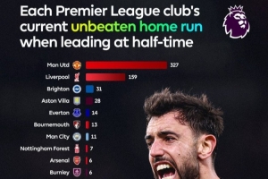 據(jù)英超官方統(tǒng)計(jì),曼聯(lián)延續(xù)著聯(lián)賽主場半場領(lǐng)先全場不敗的紀(jì)錄,場次達(dá)到327場。