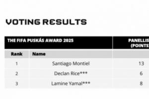 根據(jù)國際足聯(lián)官方公布的票數(shù)統(tǒng)計結(jié)果,蒙鐵爾以21分位列第一,賴斯和亞馬爾同積17分分列二三,官方僅給出了前三名的投票結(jié)果。