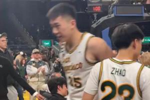 中國球員、舊金山大學(xué)后衛(wèi)趙維倫最后時刻獲得出場機會,上場1分鐘沒有運動戰(zhàn)出手,罰球2中1,得到1分。