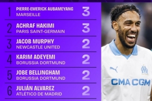 本賽季歐冠助攻榜:奧巴梅揚(yáng)和阿什拉夫均3次,分列前二