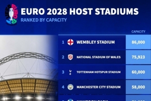 2028年歐洲杯球場容量排名:溫布利8.6萬人居首,熱刺球場6萬人