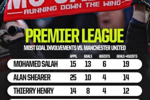 體育資訊10月17日訊 北京時間10月19日晚上,利物浦將在英超第8輪比賽中主場對陣曼聯(lián),Squawka統(tǒng)計了球員在對陣曼聯(lián)的英超比賽中的參與進球數(shù)量,薩拉赫19球居首。