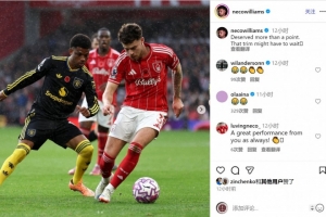 體育資訊11月2日訊 英超第10輪比賽,內科-威廉姆斯踢滿全場,幫助諾丁漢森林主場2-2戰(zhàn)平曼聯(lián)。