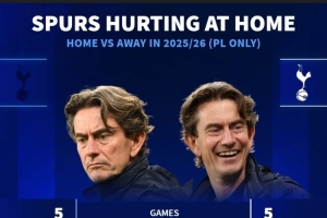 熱刺本賽季英超主場戰(zhàn)績1勝1平3負,打進5球丟掉5球,客場4勝1平保持不敗,打進12球僅丟3球。