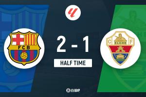 半場(chǎng)結(jié)束,巴薩暫2-1埃爾切。