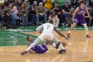 記者:在比賽第四節(jié)還剩約47秒時(shí),基昂特-喬治在杰倫-布朗突破上籃的過程中摔倒在地。隨后,布朗也倒在了喬治身上,但裁判并未吹罰犯規(guī)。對(duì)于這一回合,你的看法是什么?為什么沒有對(duì)喬治吹罰犯規(guī)?