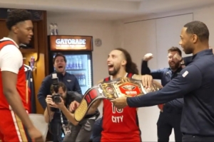 賽后,鵜鶘眾將在更衣室開(kāi)心慶祝,阿爾瓦拉多接過(guò)主帥威利·格林遞過(guò)來(lái)的金腰帶,將其頒給了奎因。
