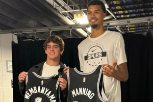 本場比賽,德克薩斯大學橄欖球隊球員阿奇·曼寧等人現場觀看了本場比賽,并受到了文班亞馬及??怂沟慕哟?。星三代阿奇·曼寧還和文班互換了球衣。
