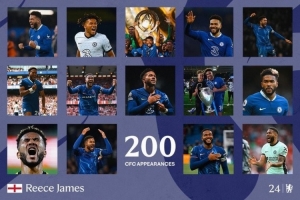 切爾西官推曬出海報,并寫道:“200場里程碑取得進球,里斯-詹姆斯是純血切爾西人?!?/p>