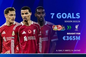 利物浦在今夏共計(jì)花費(fèi)3.65億歐元基礎(chǔ)轉(zhuǎn)會(huì)費(fèi)引進(jìn)了維爾茨(勒沃庫森)、?;倏耍ǚㄌm克福)、伊薩克(紐卡斯?fàn)枺?人至今共計(jì)貢獻(xiàn)7球5助攻。