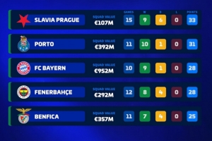 布拉格斯拉維亞(身價1.07億歐)——9勝6平積33分