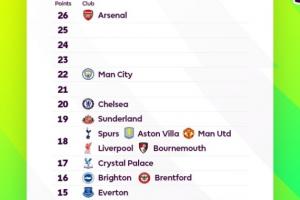 體育資訊11月12日訊 英超官方曬圖英超的“積分榜”,這份榜單以積分為序號(hào),不以排名列出。