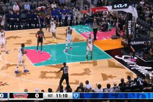 第一節(jié)庫里穿著綠色的Curry7球鞋