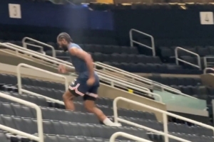 記者Noa Dalzell在賽前兩個多小時拍到了在球館內(nèi)跑臺階訓練熱身的萊昂納德。