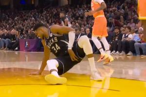 GIF-字母哥上籃落地,捂著腿根,受傷了