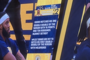 比賽首節(jié)主場(chǎng)展示以賽亞-杰克遜數(shù)據(jù)寫道:“以賽亞·杰克遜在對(duì)陣活塞時(shí)砍下16分10籃板,拿到賽季第三次兩雙,邁爾斯·特納在雄鹿還沒(méi)拿過(guò)兩雙。”