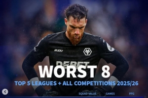 體育資訊11月21日訊 五大聯(lián)賽即將重燃戰(zhàn)火,《轉會市場》統(tǒng)計了本賽季至今五大聯(lián)賽球隊的各項賽事場均拿分最少情況,英超的狼隊以場均0.57分墊底。