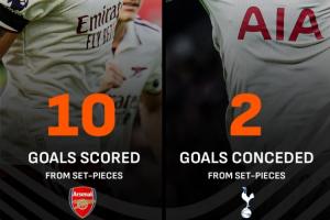 據(jù)統(tǒng)計(jì),阿森納本賽季英超通過定位球攻入10粒進(jìn)球,占總進(jìn)球的50%,這兩個(gè)數(shù)字在英超聯(lián)賽均排第一。