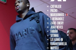 巴黎首發(fā):舍瓦利耶;帕喬、馬爾基尼奧斯、盧卡斯·埃爾南德斯、埃梅里、若昂·內(nèi)維斯、法比安、維蒂尼亞、李剛?cè)?、克瓦拉茨赫利亞、馬尤盧