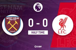 上半場(chǎng)補(bǔ)時(shí)1分鐘,西漢姆聯(lián)0-0利物浦。