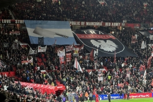 在死忠看臺(tái),一眾曼聯(lián)球迷打出大幅tifo表達(dá)對(duì)利馬的支持,將阿根廷國旗里的太陽替換為了菜刀…