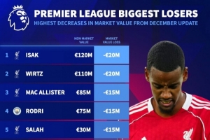 體育資訊12月9日訊 德轉(zhuǎn)更新英超球員身價,伊薩克、維爾茨均-2000萬歐,為本次更新身價下降最多的英超球員。