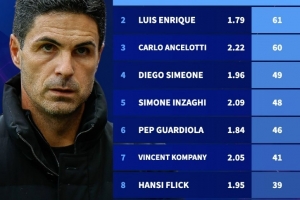 體育資訊12月11日訊 在本輪歐冠,阿森納3-0大勝布魯日,豪取6連勝。德轉(zhuǎn)也盤點了自阿爾特塔執(zhí)教阿森納歐冠首秀以來,各位主帥在歐冠同期積分榜(包括淘汰賽),具體如下(場均積分+總積分):