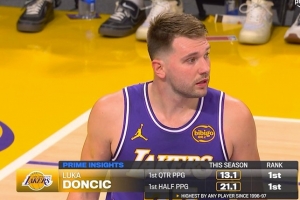 湖人VS馬刺,轉(zhuǎn)播方曬出統(tǒng)計(jì),東契奇場(chǎng)均首節(jié)13.1分&上半場(chǎng)21.1分,都是有統(tǒng)計(jì)(96-97賽季)以來(lái)的最高。
