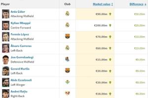 體育資訊12月12日訊 德轉(zhuǎn)更新西甲身價(jià),漲幅排行中,居萊爾以3000萬歐的漲幅位列第1,姆巴佩漲2000萬歐第2。