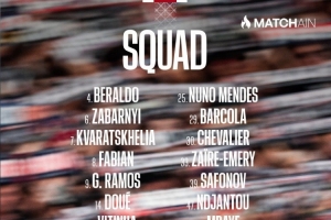前鋒:7-克瓦拉茨赫利亞、9-貢薩洛·拉莫斯、14-杜埃、19-李剛?cè)省?9-巴爾科拉、47-恩賈恩圖、49-姆巴耶
