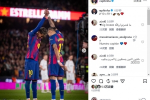 拉菲尼亞賽后更新社媒動態(tài),曬出與亞馬爾慶祝進球的合照,配文:“LY10 x R11??????????”