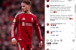 麥卡利斯特社媒曬出比賽照片,配文:“積極的一周,在安菲爾德與我們的球迷一起取得勝利,而且又一次完成零封,讓我們繼續(xù)沿著這條道路前進(jìn)?!?/p>