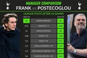 體育資訊12月15日訊 熱刺在本賽季英超高開低走,whoscored也對(duì)比了新帥弗蘭克本賽季前16輪和前任澳波上賽季前16輪的關(guān)鍵數(shù)據(jù),弗蘭克完敗。