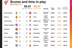 體育資訊12月16日訊 Opta統(tǒng)計了西甲第16輪的凈比賽時間,并列出榜單,巴薩vs奧薩蘇納55分33秒排名第5位,阿拉維斯vs皇馬55分18秒排在第6位。