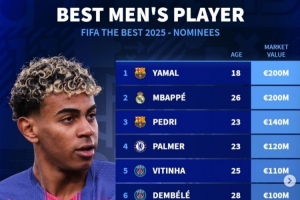 體育資訊12月16日訊 2025年FIFA年度最佳頒獎(jiǎng)典禮將在就卡塔爾多哈舉行,年度最佳球員(世界足球先生)也將揭曉?!掇D(zhuǎn)會(huì)市場(chǎng)》也列出了入選提名球員的身價(jià)排行榜,亞馬爾和姆巴佩并列居首。