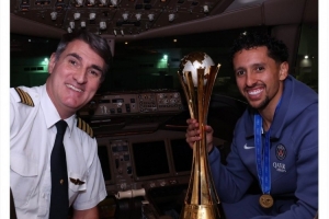 巴黎圣日耳曼球員們帶著獎(jiǎng)杯乘坐飛機(jī)返回巴黎,俱樂(lè)部官方社媒曬出隊(duì)長(zhǎng)馬爾基尼奧斯手拿獎(jiǎng)杯與機(jī)長(zhǎng)的合照,配文:“前往巴黎!”