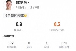 體育資訊12月21日訊 利物浦在本輪英超焦點(diǎn)戰(zhàn)對(duì)陣熱刺,維爾茨本場(chǎng)數(shù)據(jù)如下: