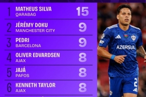 1.馬修斯-席爾瓦(卡拉巴赫):15