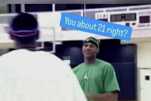 其中有一段畫面為詹姆斯和好友安東尼在訓(xùn)練館內(nèi)練球,談笑間安東尼質(zhì)疑起詹姆斯的年齡:“你其實(shí)有21歲吧?”