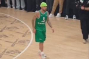 畫面中比伯身穿一件綠色6號(hào)球衣,頭戴“小綠帽”,連連得分。